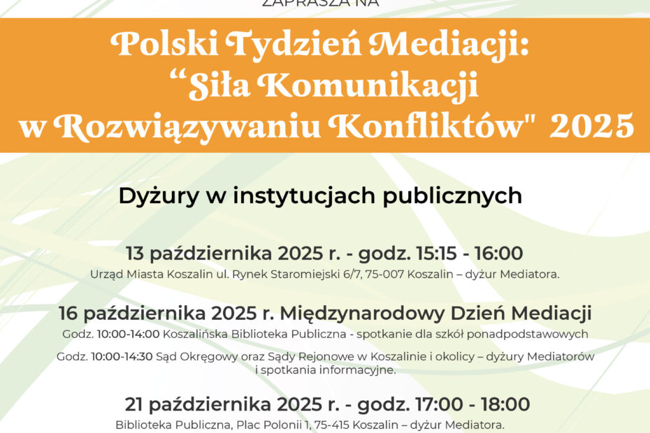 Szanowni Państwo, w ramach Polskiego Tygodnia Mediacji 2025, organizowanego pod hasłem „Siła komunikacji w rozwiązywaniu konfliktów”, w Koszalinie odbędą się dyżury mediatorów w instytucjach publicznych, placówkach edukacyjnychDowiedz się więcej »Tydzień mediacji