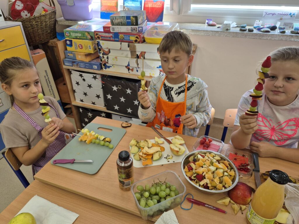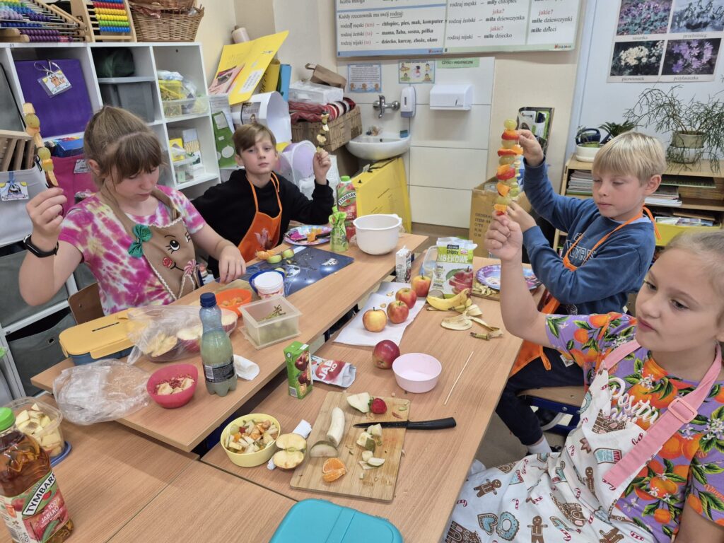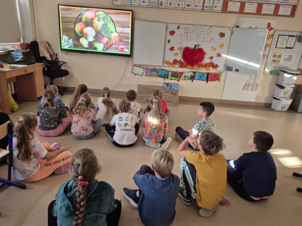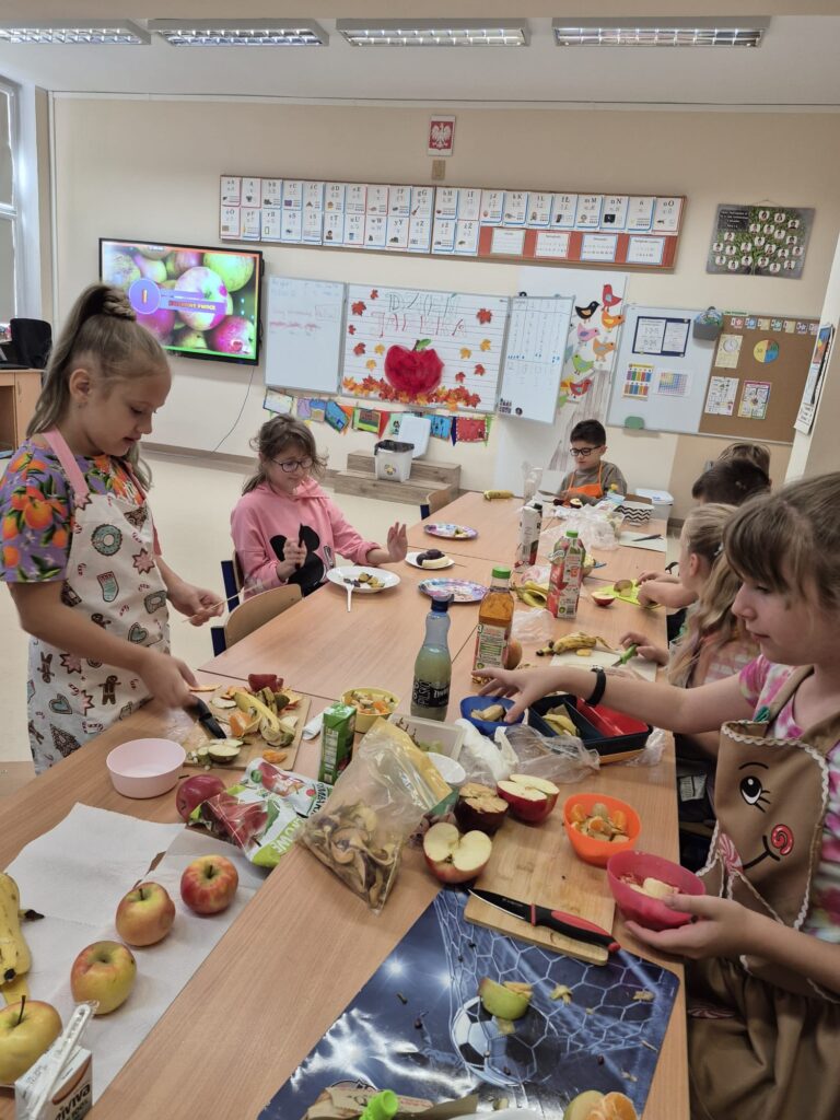26.09.2025 obchodziliśmy w klasie 3 d Światowy Dzień Jabłka. W tym dniu uczniowie utrwalili budowę jabłek, poznali różne ich różne gatunki i smaki. Dowiedzieli się, jakie przetwory można zrobić z tego owocu oraz jak ważny wpływ ma on na nasze zdrowie. Dzieci odgadywały zagadki, rozwiązywały rebusy, poznały przysłowia, doświadczały za pomocą zmysłów.Na koniec wykonały sałatkę i szaszłyki, którymi podzieliły się z młodszymi uczniami.