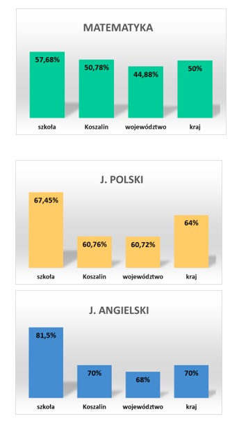 Średnie wyniki naszej szkoły z egzaminu ósmoklasisty 2025 na tle Koszalina, województwa zachodniopomorskiego i kraju.