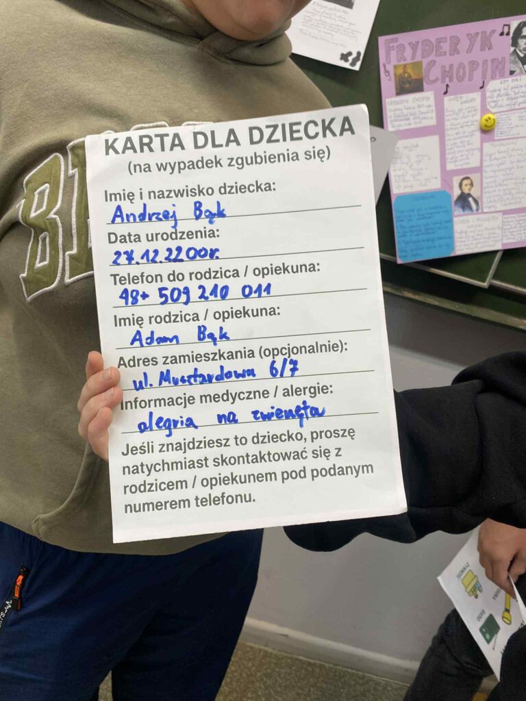 Zadaniem młodzieży było także przygotowanie planów ewakuacji z wybranych sal budynku szkolnego, kart ewakuacyjnych dla mieszkańców oraz informacji, które można zawiesić na czas ewakuacji – na wypadek zgubienia – dla osób starszych lub dzieci.