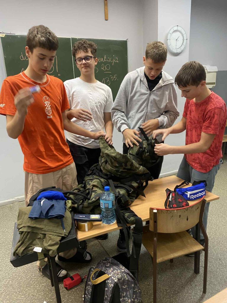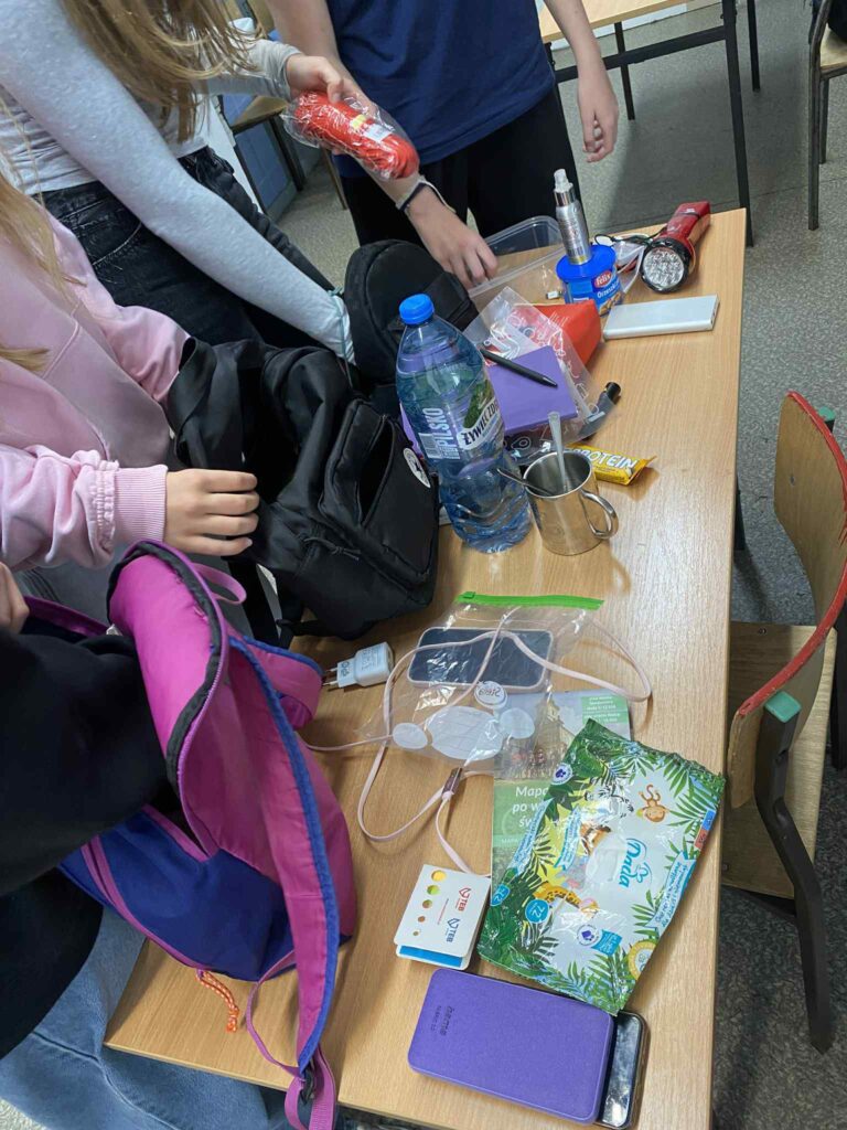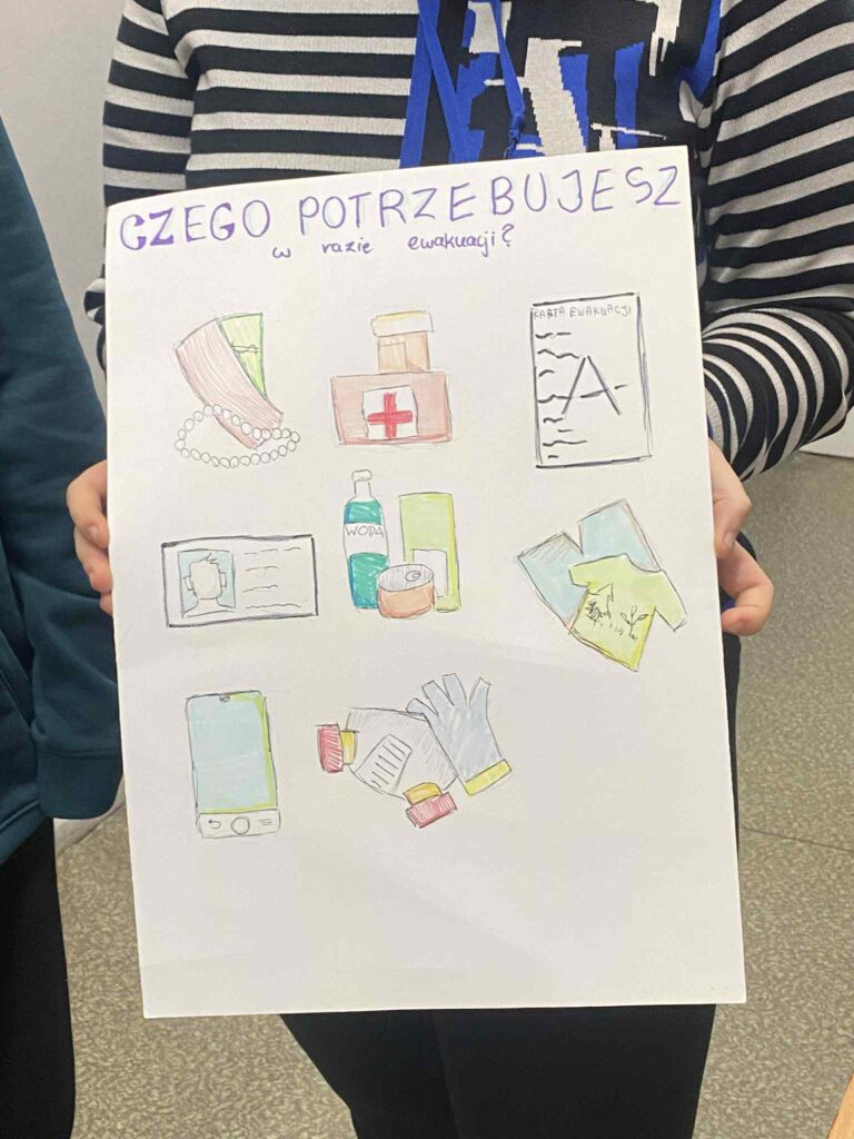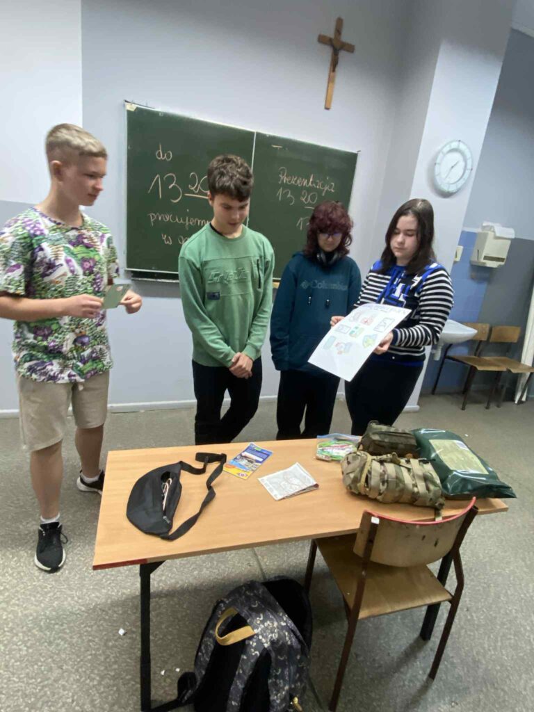 Podczas zajęć edukacji dla bezpieczeństwa @uczniowie, pracując w grupach, opracowywali zasady prawidłowej ewakuacji, kompletowali plecak ewakuacyjny oraz przygotowywali własny zestaw EDC (Everyday Carry), czyli niezbędnik na wypadek nagłych zdarzeń.
