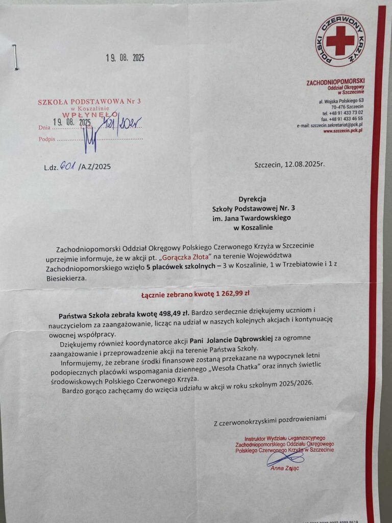 Łącznie nasza szkoła zebrała 498,49 zł. Środki zostały przekazane przez Polski Czerwony Krzyż na organizację wypoczynku letniego podopiecznych placówki wspomagania dziennego „Wesoła Chatka” oraz innych świetlic środowiskowych PCK.