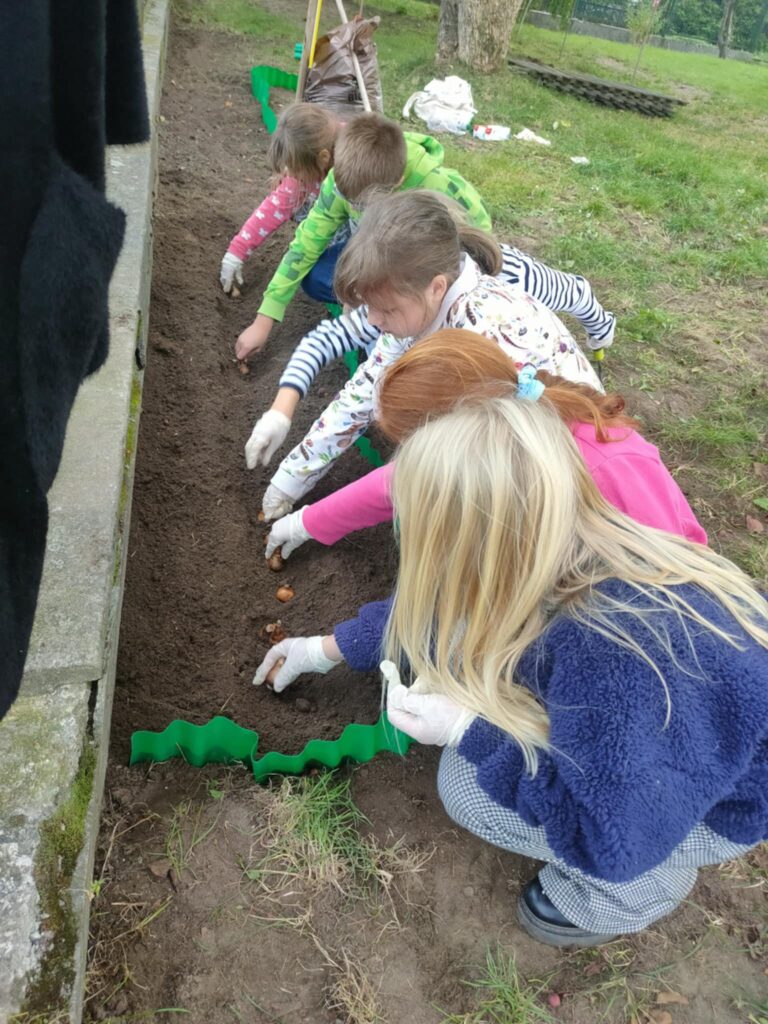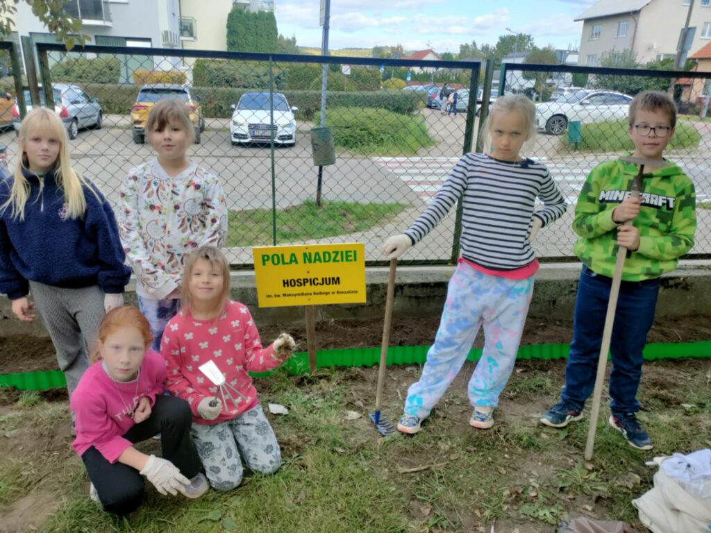 Dzisiaj 3.10 chętne dzieci biorące udział w innowacji pedagogicznej ,,Mały wolontariusz”, porządkowały miejsce przy szkole, aby posadzić cebulki żonkili – w ramach akcji ,,Pola nadziei”. Mały gest, a ma wielkie znaczenie. Ta ogólnopolska kampania ma przypominać o ludziach cierpiących, oczekujących naszej pomocy i opieki w trudnym okresie choroby