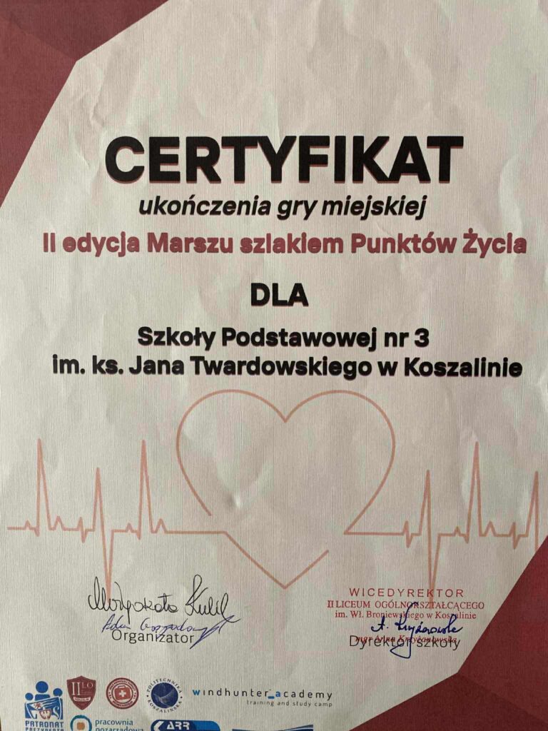 24 września 2025 roku członkowie Szkolnego Koła Ratowniczego wzięli udział w grze miejskiej „Marsz Szlakiem Punktów Życia”. Wydarzenie, zorganizowane przez II Liceum Ogólnokształcące w Koszalinie, odbyło się pod patronatem Prezydenta Miasta Koszalina.